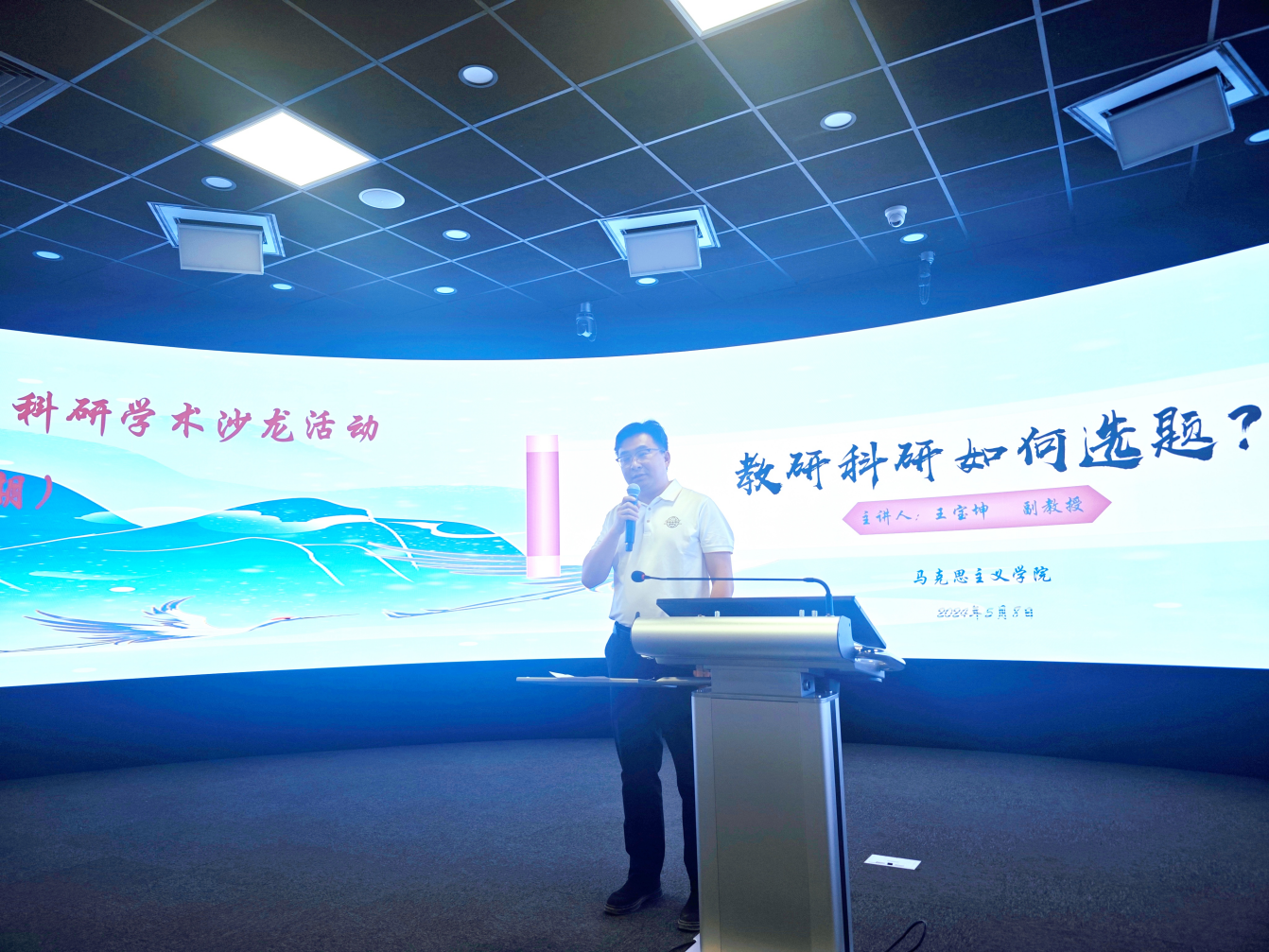 为着力加强“科研强院”建设目标,提升学院青年教师的科研水平及能力,以昂扬的姿态迎接本科教学工作合格评估,5月8日下午,马克思主义学院开展“研学论道”教学科研学术沙龙第一期活动。本次活动由学院副院长吴钰主持,银龄教授王宝坤主讲,银龄教授倪培强、张全省担任点评,学院党总支副书记马健斌出席活动并讲话,全体专任教师参加。