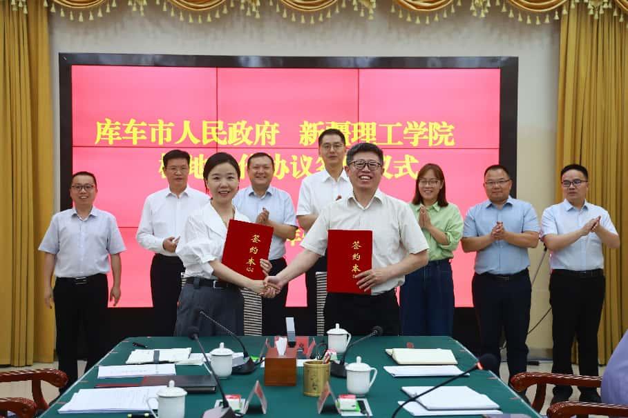 新疆理工学院党委常委、副校长王宏与库车市政府党组成员、副市长张铁玲代表双方签订《库车市人民政府与新疆理工学院校地合作协议》。